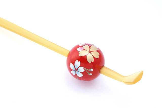 大きめの鮮やかな赤い玉に桜の花が描かれています。