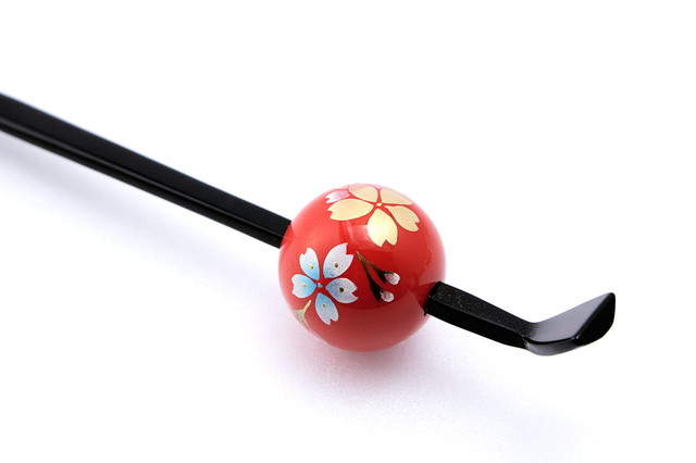 大きめの鮮やかな赤い玉に桜の花が描かれています。