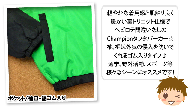 | コメント | 軽やかな着用感と肌触り良く暖かい裏トリコット仕様でヘビロテ間違いなしのChampionタフタパーカー☆袖、裾は外気の侵入を防いでくれるゴム入りタイプ♪通学、野外活動、スポーツ等様々なシーンにオススメです! |