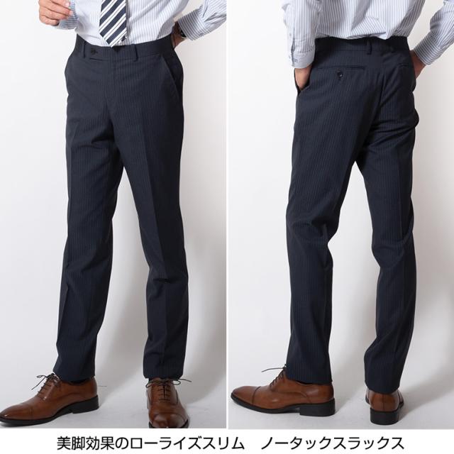 スラックスはノータック、腰周りがスマートに見える美脚シルエット。