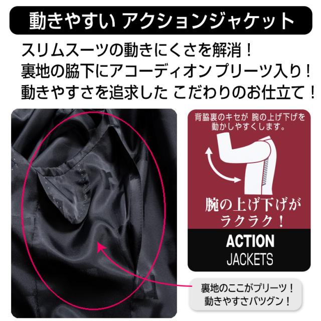 ジャケットは腕の上げ下げがスムーズなアクションプリーツ仕様。