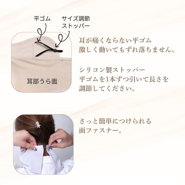 耳の平ゴムや面ファスナーで自分の顔にフィットするサイズに調節できます