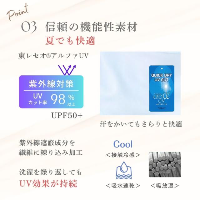 UVカット(上部99%以上)の高機能生地使用(接触冷感・吸汗速乾・放湿)