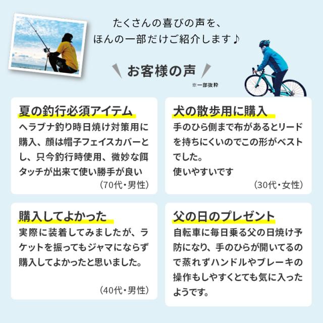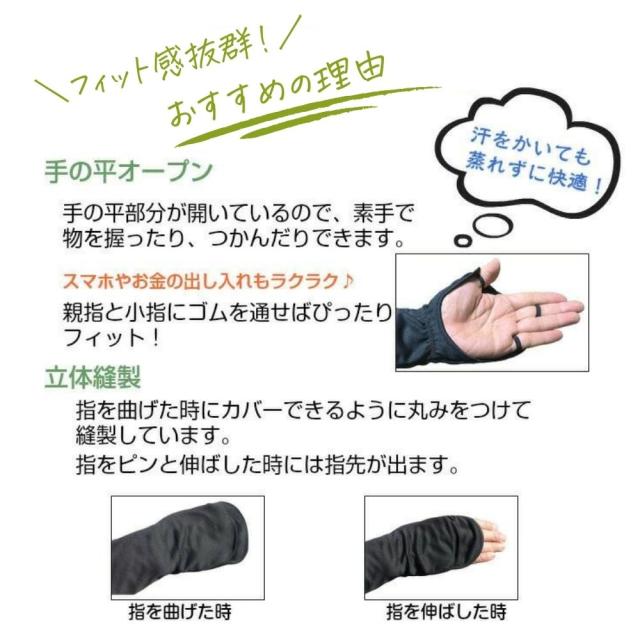 ★手の平オープン手袋の不便さ解消!素肌で物をつかめるので滑りません。モバイルやお金の出し入れもラクラク!汗をかいてもムレずに快適♪★ぴったりフィット指を曲げた時、生地が指をしっかり覆うラウンド構造。手を入れて、ゴムを通すだけで、ぴったりフィット!★しっかり紫外線カット繊維自体がUVカット素材なので、繰り返しのお洗濯にもUV効果持続(東レ セオαUV糸)自転車・車の運転などの日焼け防止に!
