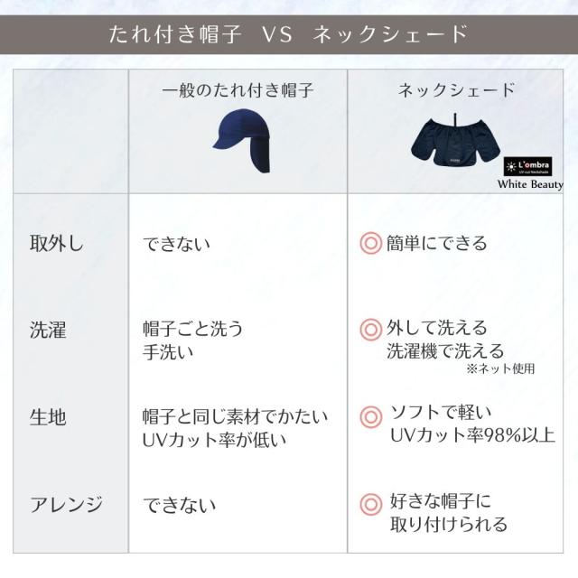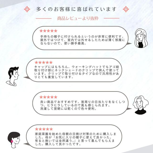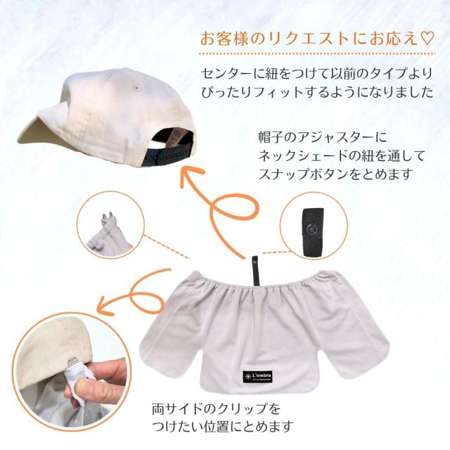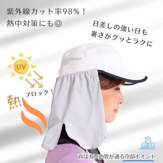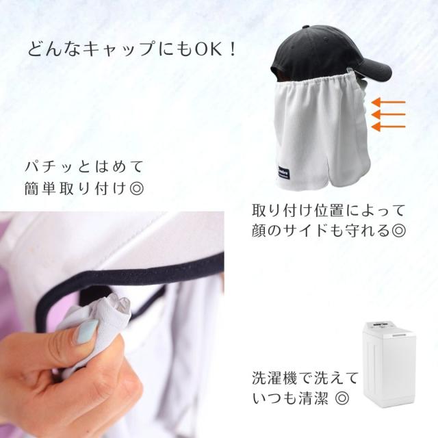 お手持ちのキャップに簡単に取り付け可能で、首すじを太陽熱や紫外線から守ります。