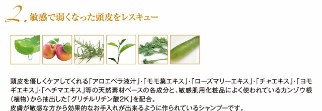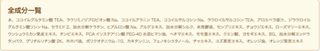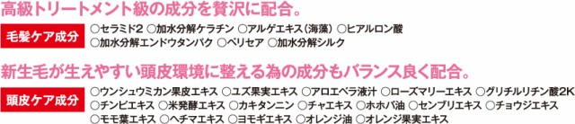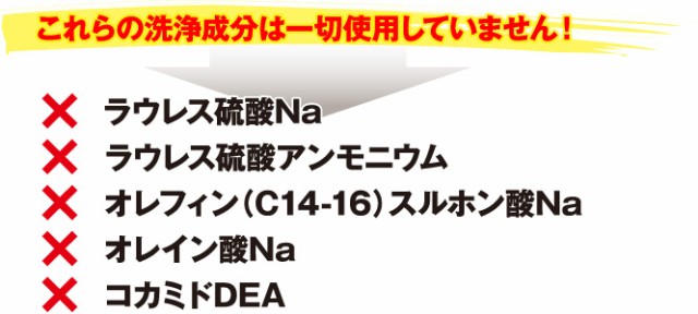 全成分:水、ココイルグルタミン酸TEA、ラウリミノジプロピオン酸Na、ココイルアラニンTEA、ココイルサルコシンNa、ラウロイルサルコシンTEA、アロエベラ液汁、ジラウロイルグルタミン酸リシンNa、サラミド2、加水分解ケラチン、ヒアルロン酸Na、アルゲエキス、加水分解シルク、米発酵液、センブリエキス、チョウジエキス、ローズマリーエキス、ウンシュウミカン果皮エキス、チンピエキス、PCAインステアリン酸PEG-40水添ヒマシ油、ヘチマエキス、モモ葉エキス、クエン酸、ヨモギエキス、BG、加水分解エンドウタンパク、グリチルリチン酸2K、ホホバ油、ポリクオタニウム-10、カキタンニン、フェノキシエタノール、チャエキス、ユズ果実エキス、オレンジ油、オレンジ果実エキス※旧表示指定成分は無添加で作られています。