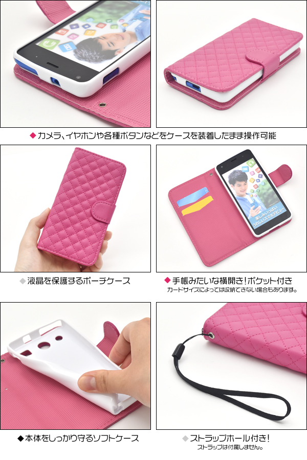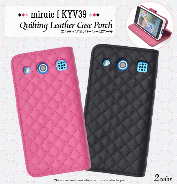 触り心地抜群のキルティングレザーを使用したオシャレなケースポーチです。 内部に備えられたソフトケースでしっかり固定し、 衝撃やキズ、埃などからmiraie f KYV39をしっかりと守ります。 背面を折り返すとスタンドとして使用できるので、動画視聴に便利です。ポーチの内側にはポケットが付いているので、カード類を入れるのに便利!ケースを装着したまま、充電やヘッドフォンジャックの接続、カメラや各種ボタンの操作も可能です。※miraie f KYV39は付属しません。ライセンス商品ではありません。※ケースをつけたまま撮影できますが、フラッシュ撮影時にケースの色が移り込むことがあります。
