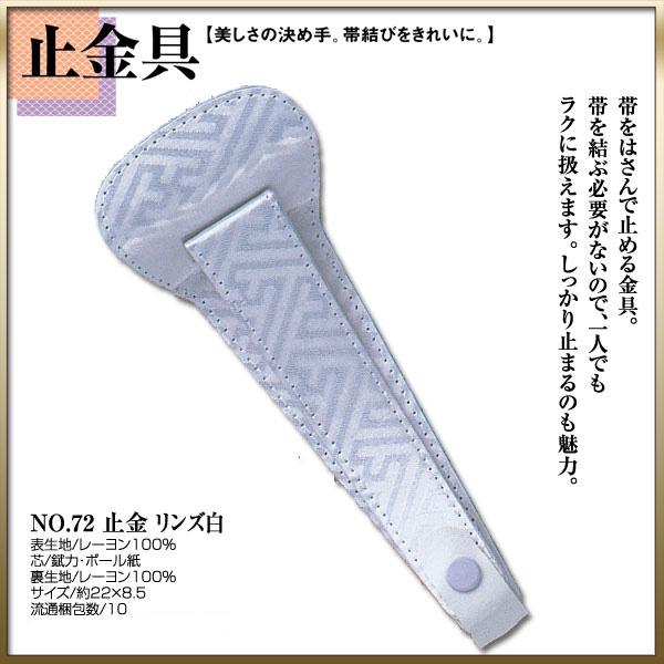 止金具 No72 止金【リンズ白】美しさの決め手!帯結びを綺麗に!帯を挟んで止める金具。帯を結ぶ必要がないので、一人でも楽に扱えます。帯の美しさは着物姿の要。きりっと結ぶために、便利な止金具を使えば、結び上がりが違ってきます。特に、やや堅い帯は扱いづらいもの。止金具を使えば帯を結ぶ必要がないので、きれいに決まります。きものや背中に沿うソフトな形だから、帯も傷めず、違和感も有りません。どんな素材の帯びでも、自信をもって結ぶことが出来ます。