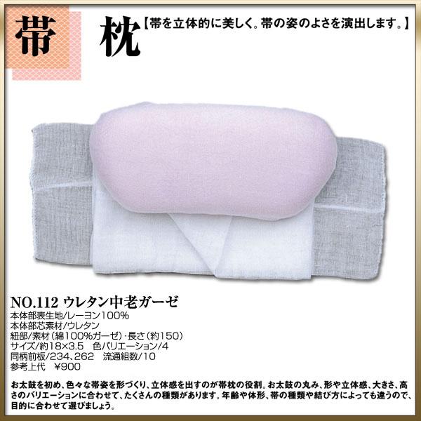 【和装着付け小物・道具】帯枕 No.112【ウレタン中老ガーゼ】帯を立体的に美しく。帯の姿のよさを演出します。お太鼓を初め、色々な帯姿を形づくり、立体感を出すのが帯枕の役割。お太鼓の丸み、形や立体感、大きさ、高さのバリエーションに合わせて、たくさんの種類があります。世代や体形、帯の種類や結び方によってちがうので、目的に合わせて選びましょう。