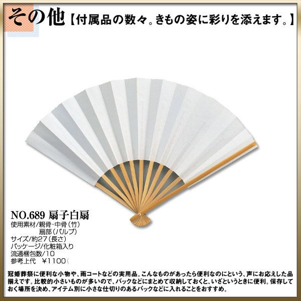 No.689【扇子白扇】きもの姿に飾りを添えます。冠婚葬祭に便利な小物。こんなものがあったらいいなという声にお答えした品揃えです。比較的小さなものが多いので、バックなどにまとめて収納しておくて、イザというときに便利。保存しておく場所を決め、アイテム別に小さな仕切りのあるバックに入れることをオススメ。