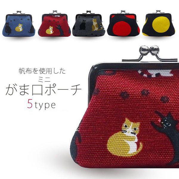 日本製 帆布の がま口 ポーチ 選べる5タイプ ミニサイズ 小銭入れ 猫 青 赤 グレイ 灰色 丸 ドット プレゼント 贈り物