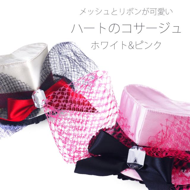 在庫限り! おしゃれなハートのシルクハット コサージュ 【ラインストーン リボン メッシュ】特価 ホワイト ピンク