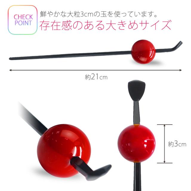 日本髪にぴったりの大粒玉かんざしです。存在感のある3cm玉を使用、花魁スタイル等にも最適なカラーバリエーション。まとめ髪やお団子に差してお使いください。◆サイズ玉直径:約3cm全体の長さ:約21cm