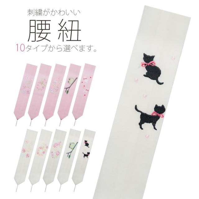 日本製 刺繍の腰紐 選べる10タイプ 妃女着 ひめざ 白 ピンク ネコ フクロウ 打ち出の小槌 花紋 紅葉 腰ひも 選べる2色 白 ピンク お腰紐 かわいい デザイン