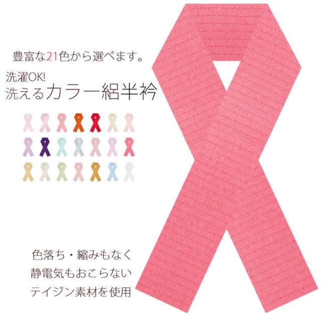半衿は着物の大事なコーディネートのポイントです。選べるカラー、なんと21色!あなたの欲しいカラーも、きっと見つかるはず!洗っても縮むことなく、風合いも変わりません。色落ちや静電気の心配もありません。