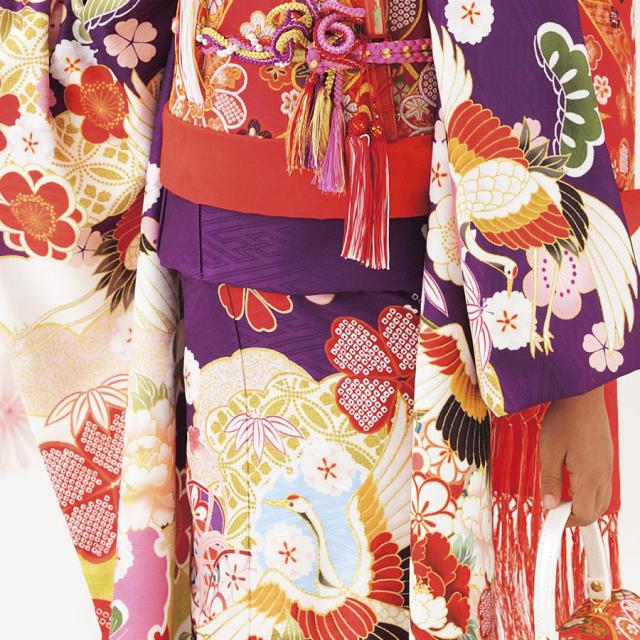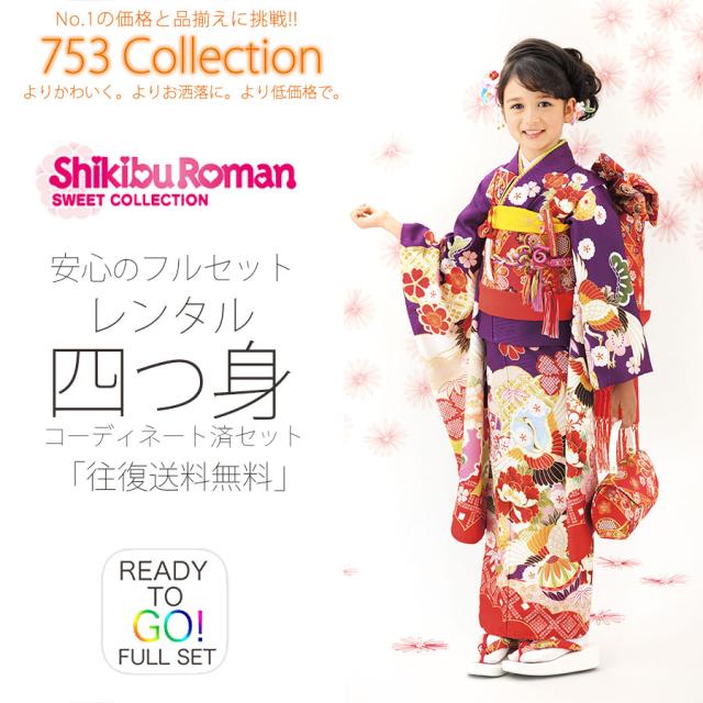 式部浪漫 七五三 レンタル 四つ身 着物 七五三 貸衣装 女児 和服 セット 古典 往復送料無料 紫 鶴 金