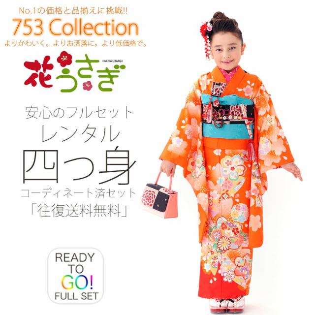 花うさぎ 七五三 四ツ身 着物 レンタル 7歳 貸衣装 七五三 子供 女児 和服 セット 日本舞踊 往復送料無料 橙 オレンジ 桜