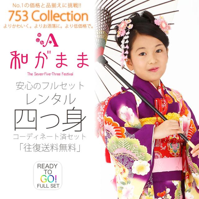 和がまま 四ツ身 レンタル 着物 7歳 貸衣装 七五三 子供 女児 和服 セット 日本舞踊 往復送料無料 紫 松竹梅