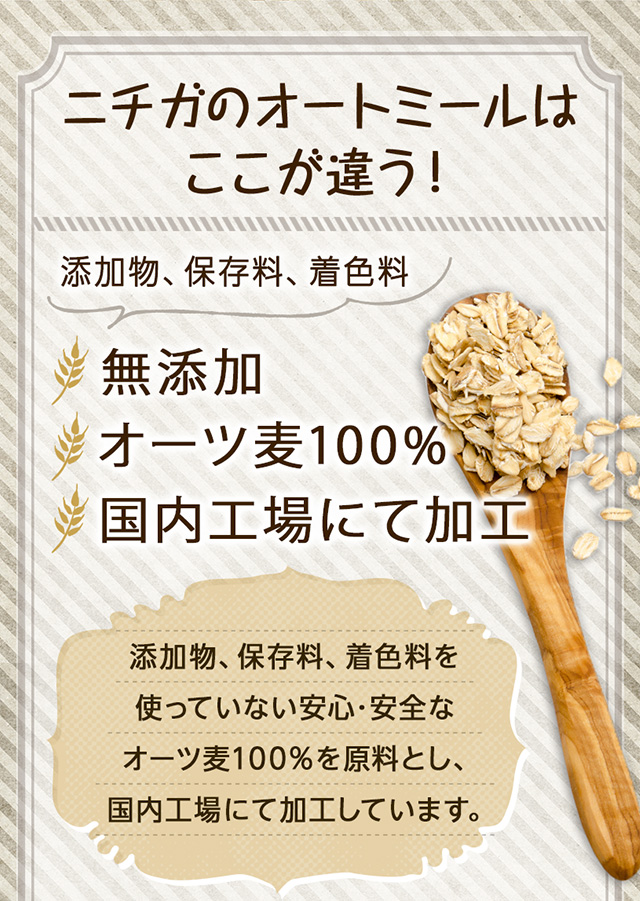 オーツ麦100%を原料とし、保存料・着色料を一切使用せずに国内工場で加工を行っております。