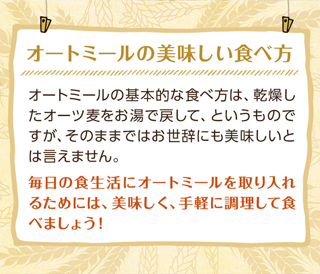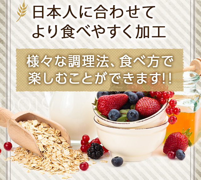 日本人にあわせて加工されたオーツ麦100%のオートミールです。 健康的な朝食に、離乳食に、食材にと、食べ方いろいろ。 ・ホットシリアル、スープに入れたり、グラノーラ、シリアルバー、ミューズリー、お粥などにお使いください。 ・クッキーやパンにお好みで配合しても食感が楽しめます。 |