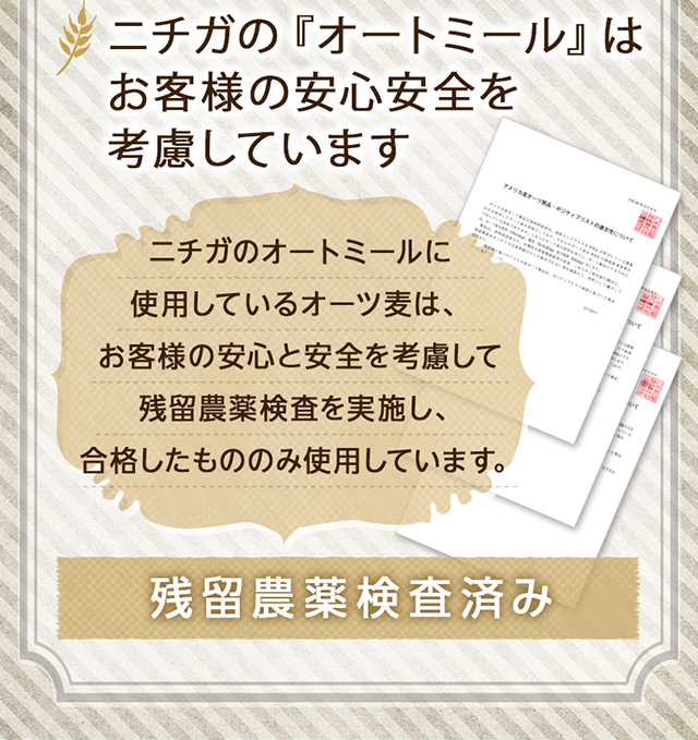【ポジティブリスト適合品】 こちらの商品は、オーツ麦(えん麦) アメリカ又はオーストラリア又はフィンランド当該制度に適合していることを保証しており、分析においても適合を確認しております。 ※ポジティブリスト制とは、基準が設定されていない農薬等が一定量以上含まれる食品の流通を原則禁止する制度。 |