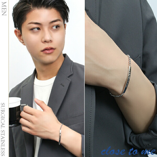 斜めにカットされた細身のプレートがスタイリッシュなサージカルステンレスペアブレスレットです。