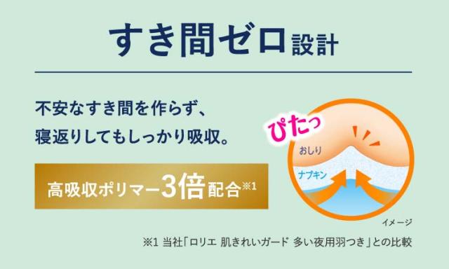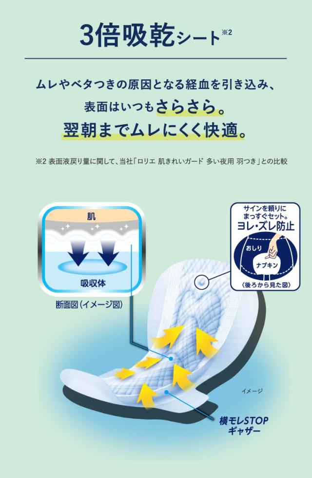 ●高吸収ポリマーを「ロリエ肌きれいガード 多い夜用 羽つき(医薬部外品)」の3倍配合。
