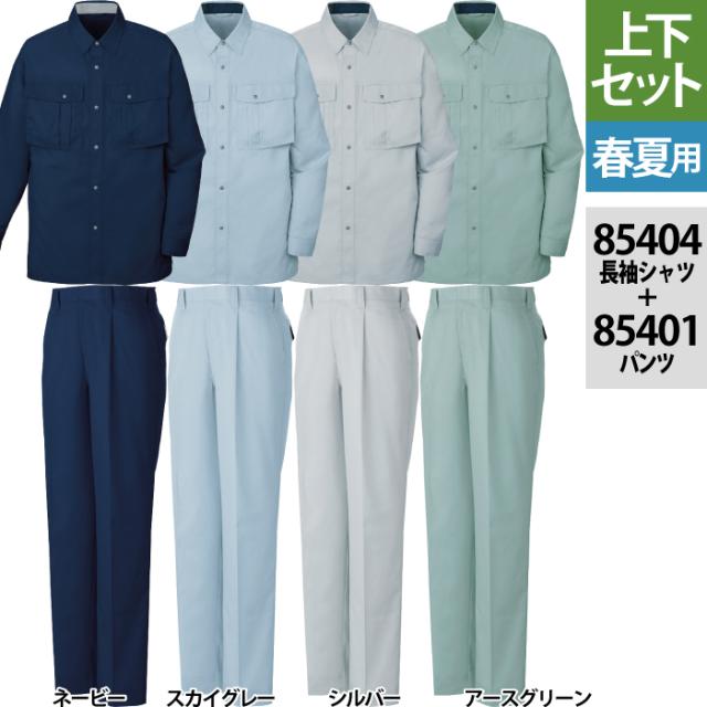 85404長袖シャツ&81401ワンタックパンツ●エコ・防汚加工・製品制電で、機能充実。納得プライスのオーソドックスなシリーズ。●根強い人気のジャンパーを中心とする、リーズナブルなシリーズ。