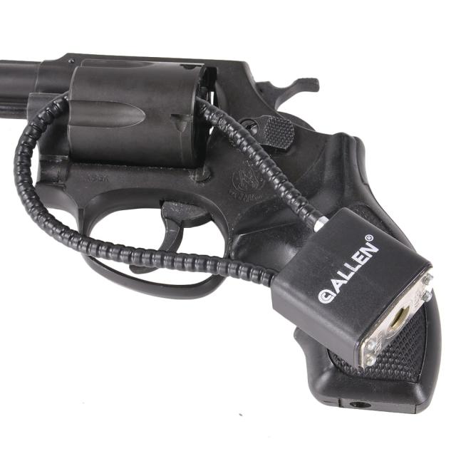 銃を傷つけないように樹脂カバーで覆われたワイヤーケーブルをスライドやボルトが閉鎖しない様に通す事で装填そのものを防ぐ、南京錠タイプのガンロック。
