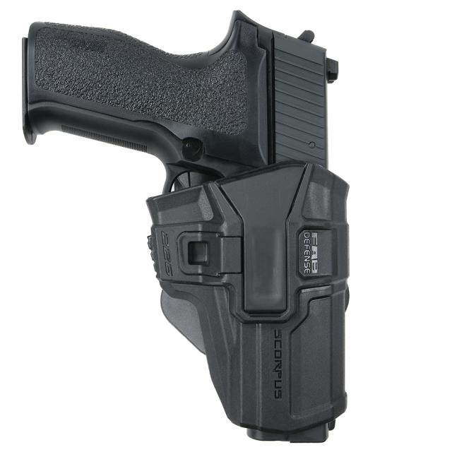 ロック機構はScorpusシリーズのLevel 1保持システムを採用しており、収納する事でトリガーガード部分にロックがかかる構造。解除する際はボタン等を押す必要は無く、少し強めに引き抜くことで素早いドローが可能です。