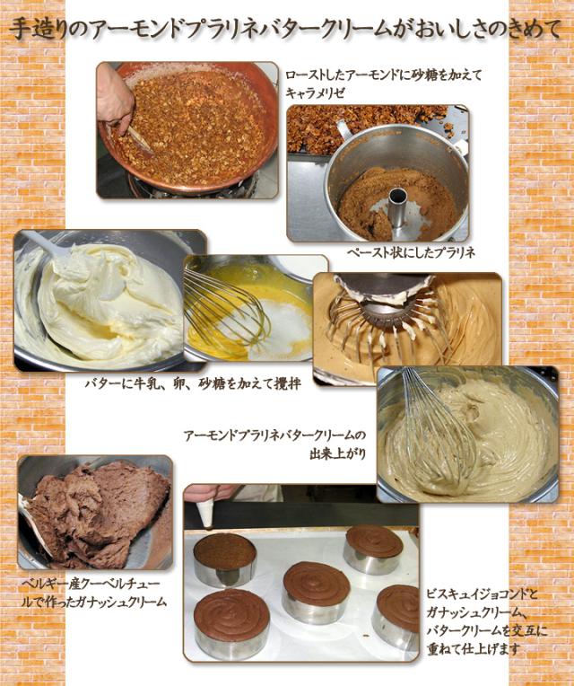 コーヒーを浸み込ませたアーモンドのビスキュイ・ジョコンド(スポンジケーキ)とガナッシュクリームを何層も重ねた間に、 アーモンドプラリネの本格バタークリームをサンドした深い味わいのチョコレートケーキです。