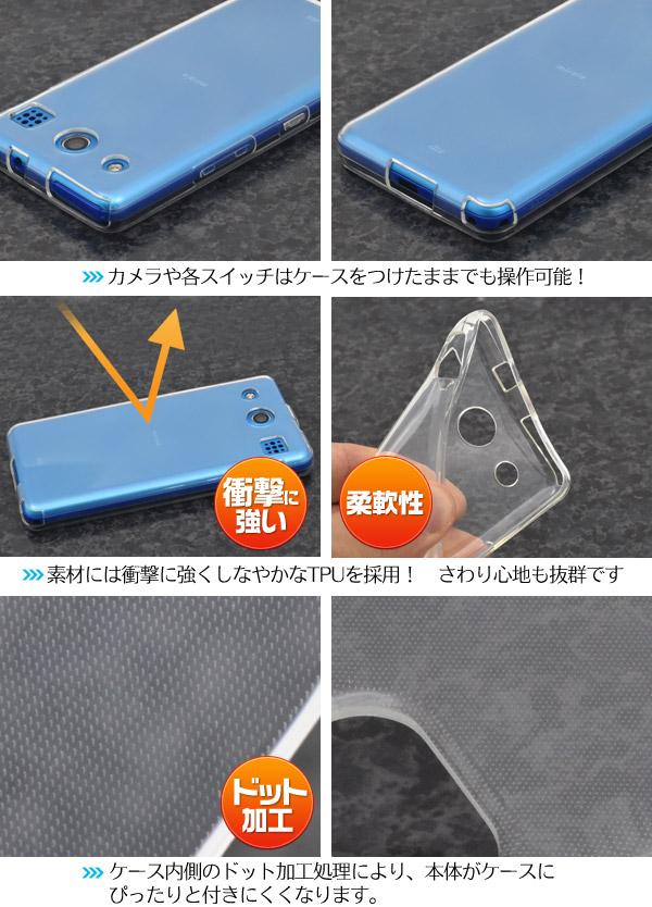 シンプルな透明のソフトクリアケース。素材は適度な硬さと弾力性をあわせ持つTPUを採用。 衝撃に強く耐久性に優れ、手触りも抜群です。ケース内側のドット加工処理により、本体がケースにぴったりと付くのが解消され、ケースが装着しやすくなります。もちろん、装着したまま充電や各種ボタンの操作も行えるようにデザインされています。