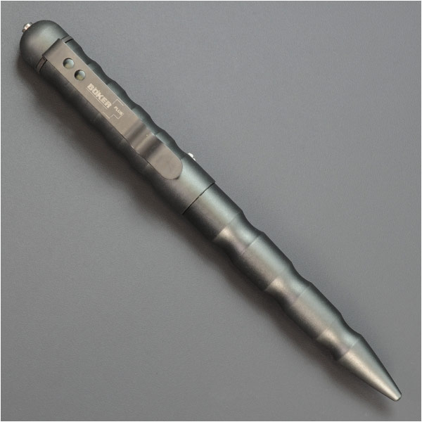 ボーカーのクボタンとしても使用できるアルミニウム製タクティカルペン。ペンキャップはねじ込み式になっているためキャップを無くしてしまう事も少なく、ポケットクリップが付いているので、持ち運びに便利。