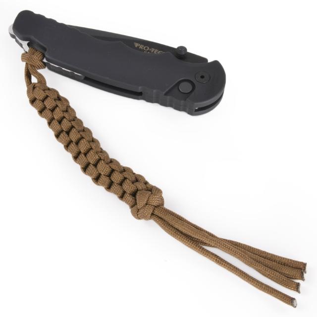 ランヤードコードやキーホルダーでよく使用される角編みのパラコードストラップ。ナイフに付ければポケットやシースからスムーズにナイフを取り出すことができます。パラコードはインナーコア(芯)に7本の糸が入ったタイプ3を使用。