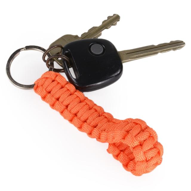 パラコードをコブラステッチ(平結び)でループ状に編んだキーリングホルダー。耐水性・耐久性に優れたナイロン製なので、編みをほどけば緊急時やアウトドアでロープとして使用可能。
