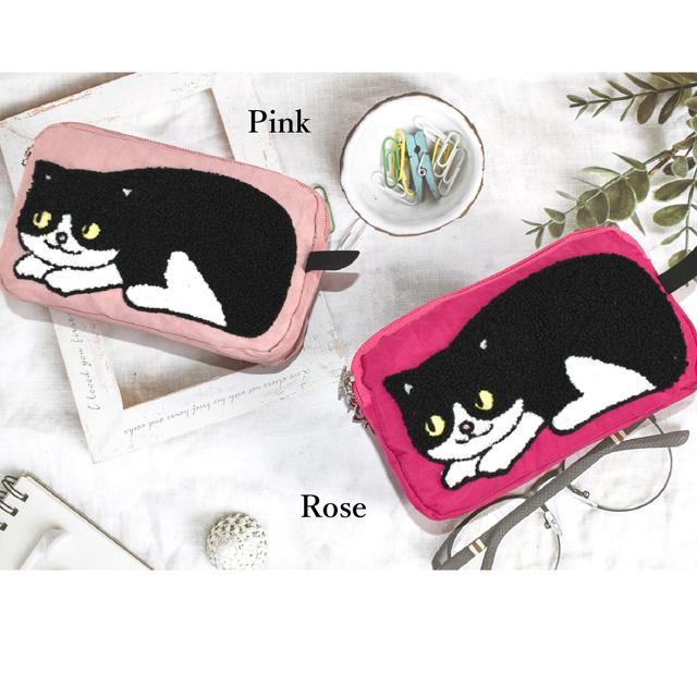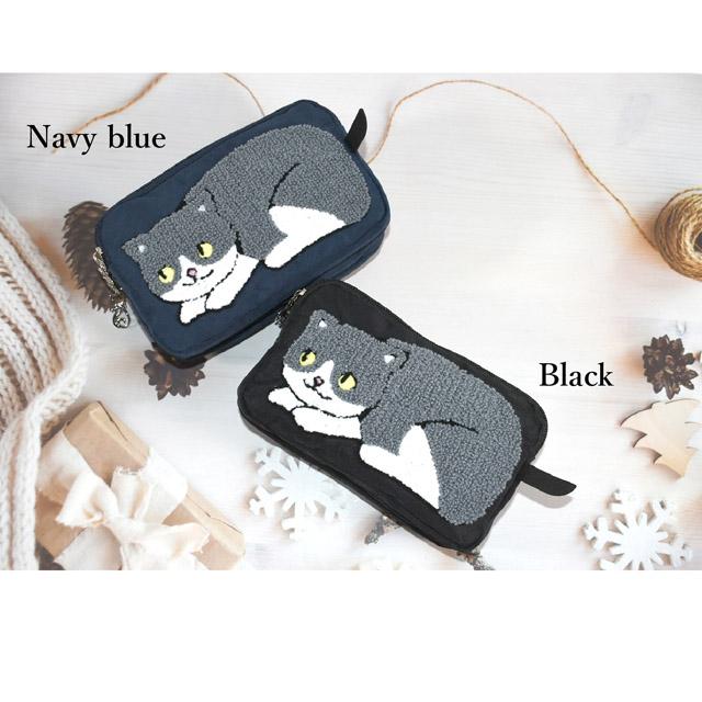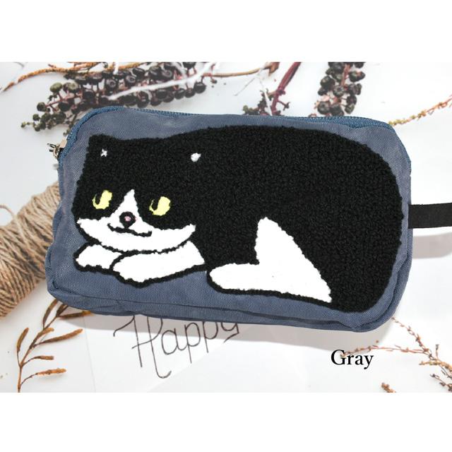 ナイロン生地にモコモコしたボリューム感のある猫ちゃん刺しゅうが可愛いデザイン♪