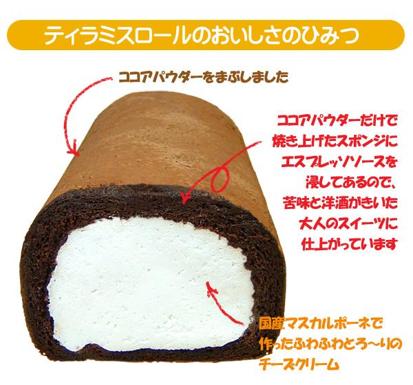 「ティラミスロール」は、国産(北海道産)のマスカルポーネをつかった、ふわふわとろ〜りのティラミスロールケーキです。 ココアとエスプレッソの苦味がきいた大人の味