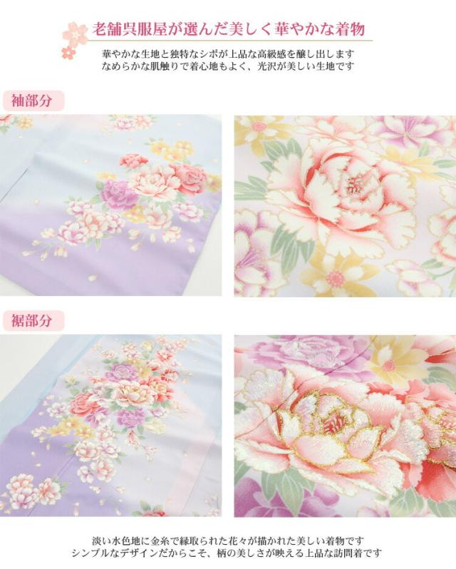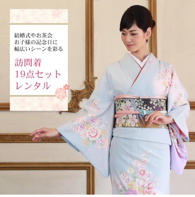 訪問着 レンタル 19点フルコーディネートレンタルセット「水色地に金の縁取り牡丹」結婚式 入学式 七五三