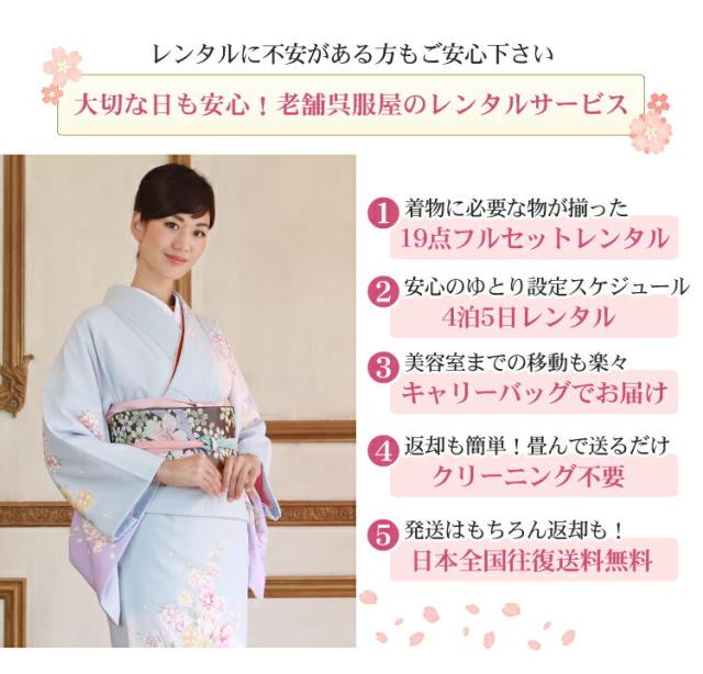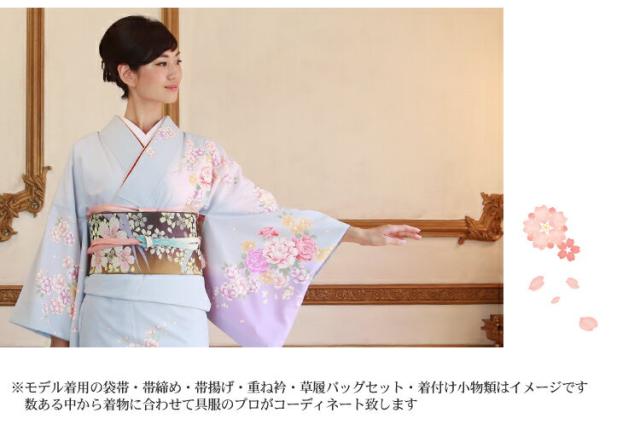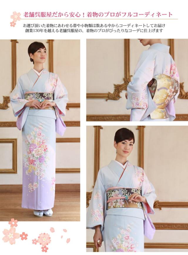 | ※モデル着用の袋帯・帯締め・帯揚げ・草履バッグ・小物類の色、デザインはイメージです。 数ある中から呉服のプロがコーディネートしてお届け致します。 | |||