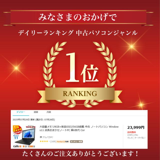 大容量メモリ8GB+SSD256GB搭載 中古 ノートパソコン Windows11 店長おまかせノートPC 第6世代 Corei5 15インチワイド Office付き 中古パソコン 送料無料