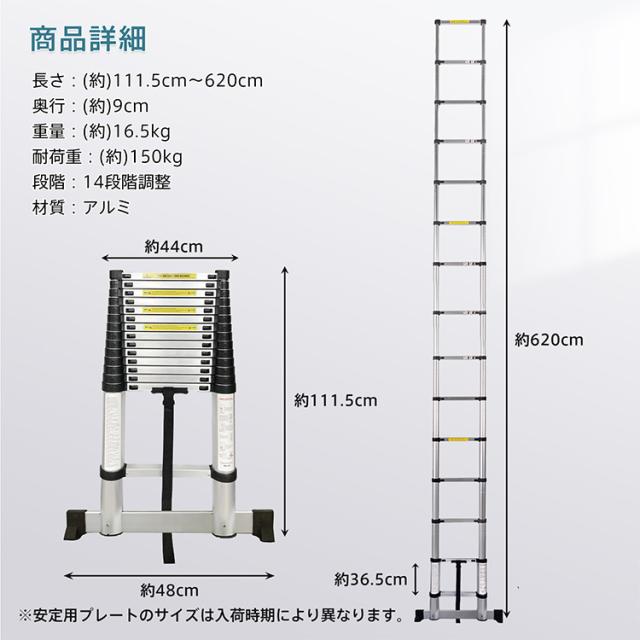 はしご 伸縮 6.2m アルミ コンパクト 調節 調整 14段階 111.5cm 収納 持ち運び ハシゴ 梯子 作業 取り替え DIY zk199