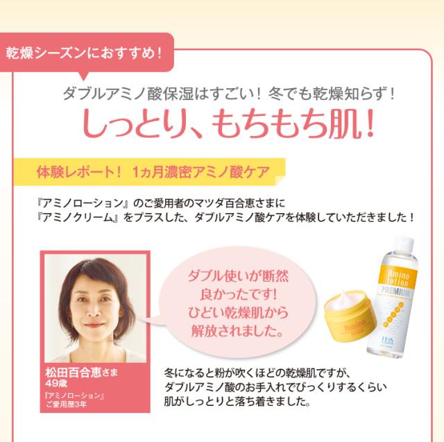 - 毎年、冬の乾燥する時期に保湿する化粧品を購入してますが、やっぱり、アミノローションとアミノクリームに戻ります。使用後は肌がしっとり感があり保湿力があります。 今回ポイント利用の為、こちらのお店で購入さ...
