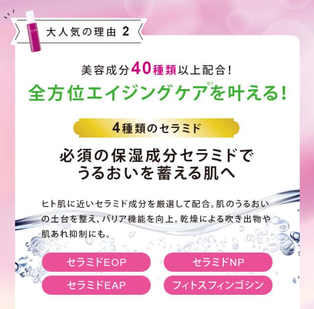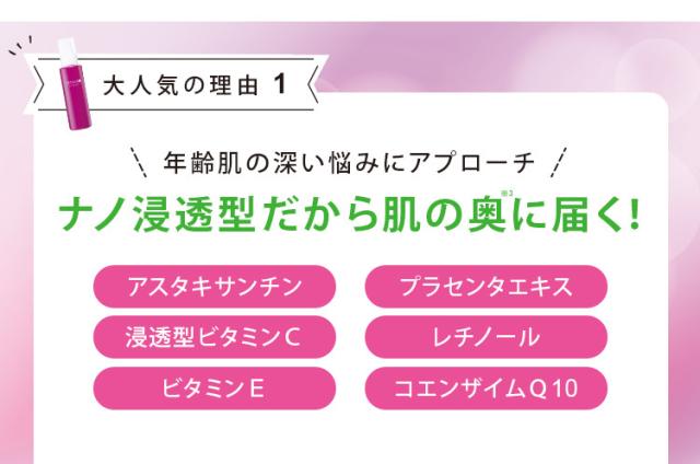 ナノ微粒子の浸透力、40種類以上の美容成分、高い保湿力、肌へのやさしさなど、従来の機能はそのままに新成分をプラスし、より美肌力をアップ!