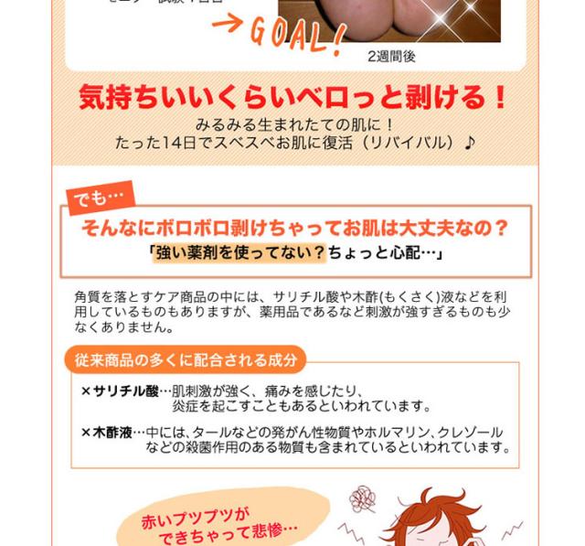 - 成分が良さそうで選びました。私は丁度1週間後に突然細かく剥がれだし3日程ソックスの中が粉をふいたようになり10日後にはかかともやわらかくツルッとなりました。刺激等も全く無くまたセールの時にストックした...