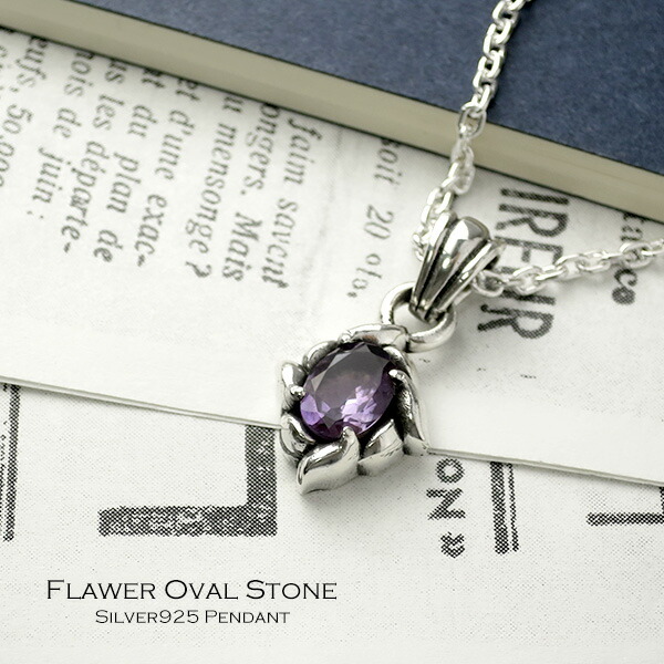 オーバル ストーン フラワー シルバーネックレス (チェーン付) ペンダント 天然石 カット 楕円 オニキス トパーズ アメジスト 花 花びら シルバー925