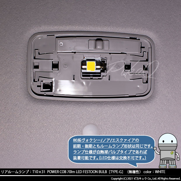 ◆80系ヴォクシー/ノア/エスクァイアの前期・後期ともルームランプ形状は同じです。ランプ仕様が白熱球バルブタイプであれば装着可能です。(LED仕様は交換不可です。)