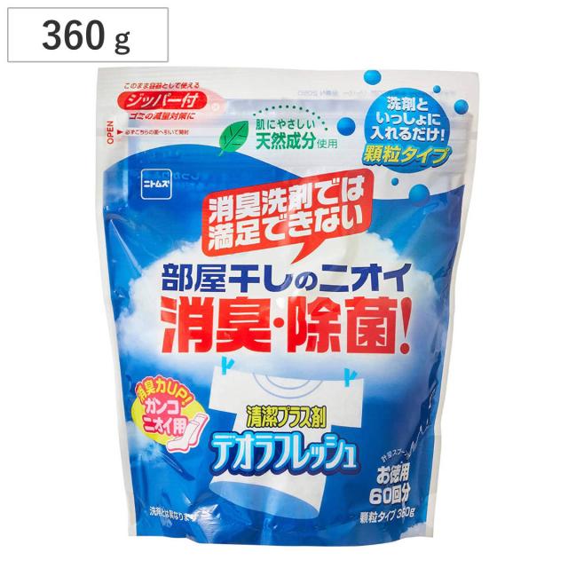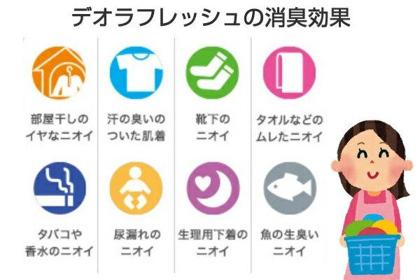 デオラフレッシュは洗剤だけでは落ちにくい部屋干しや汗などのニオイをしっかりとる洗濯助剤です。洗剤や柔軟仕上げ剤の香料のニオイも消臭します。(継続使用することによって効果が高くなります。)