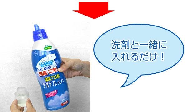 洗濯時に洗剤とともにデオラフレッシュを入れるだけで、部屋干しのニオイを消臭、除菌します。洗濯前につけおきするともっと効果的です。