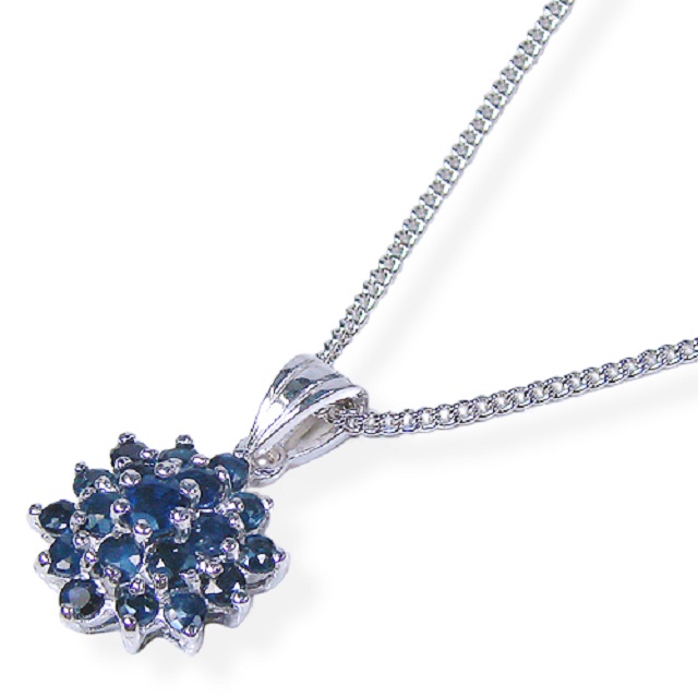 9月の誕生石サファイア19石が花を咲かせた豪華なペンダント。