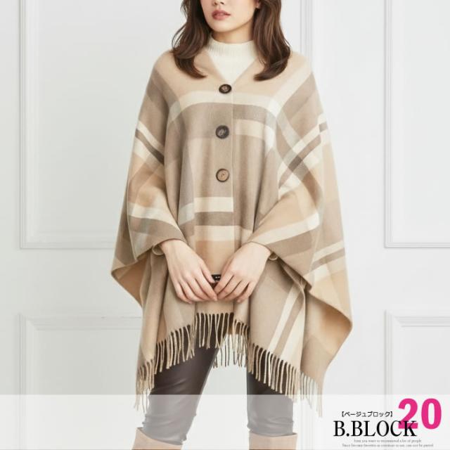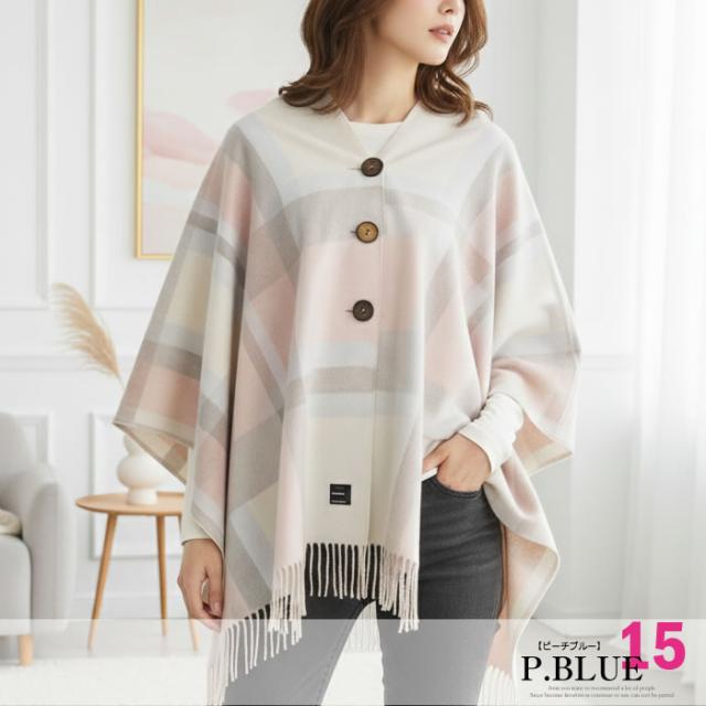 暖かなしっかり素材でふんわり心地よいBIGボタン付き大判チェックストール♪
